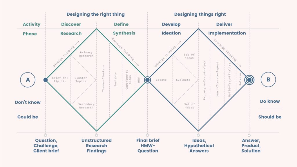 A discovery starts broad and requires team members to investigate the context of the problem. The double-diamond diagram introduced by the UK Design Council — and reproduced below — illustrates the high-level process of discovery: first, the team expands its understanding of the problem by researching its full context; armed with this knowledge, the team agrees on what the problem is, before moving to the next phase of ideating and testing in the Develop stage.